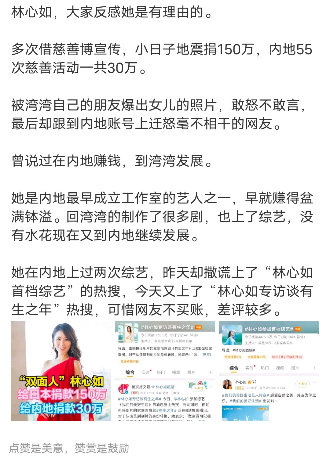 其竣事在林心如在专家口碑会这样彰着南北极化,大要亦然因为她身上的争议点确凿是太多了。